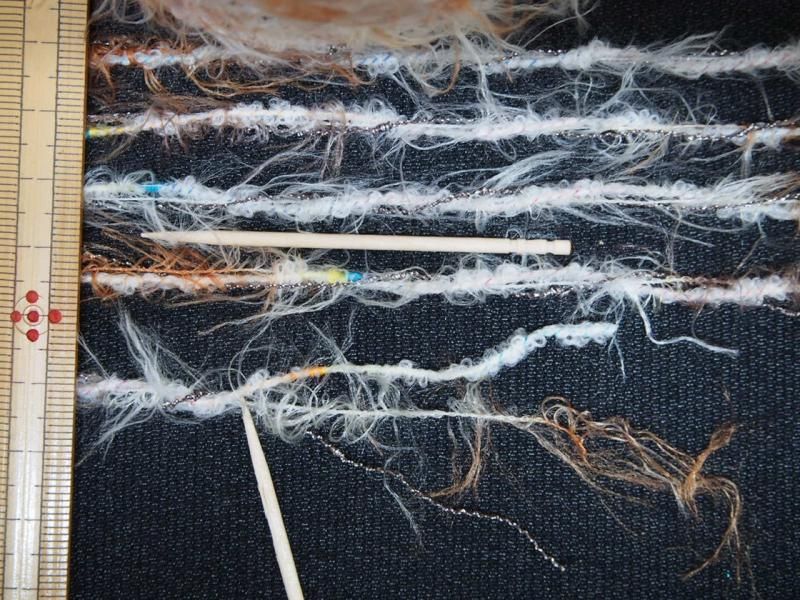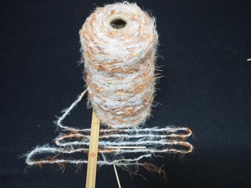 白のリング糸に絣ノットを施した糸と黒のラメ入りノット糸と